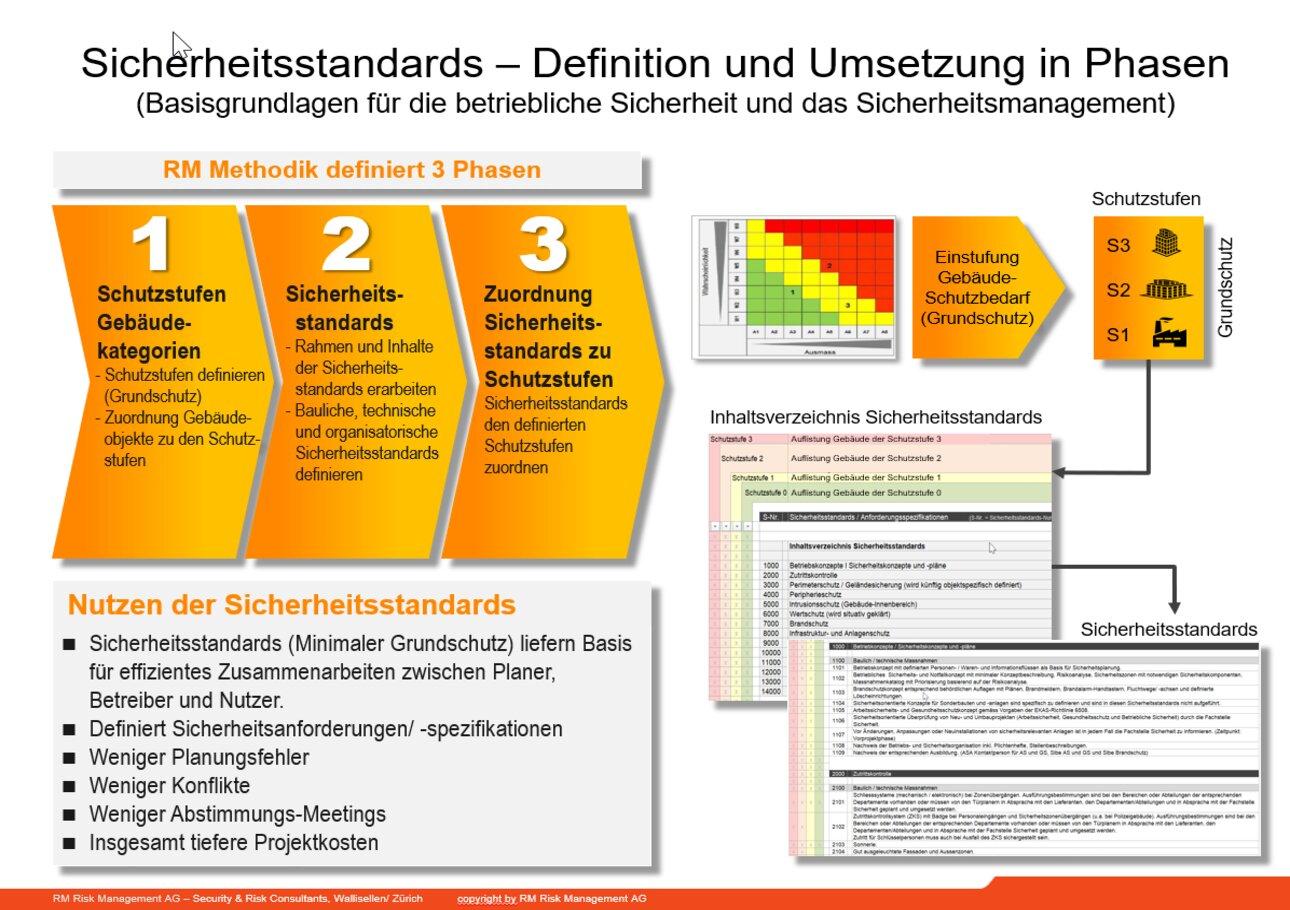 Sicherheitsstandards legen fest, welche Massnahmen, Anforderungen und Verantwortlichkeiten notwendig sind, um Risiken systematisch zu reduzieren. Schutzstufen ordnen Objekte, Prozesse und Bereiche nach Kritikalität und Auswirkung im Schadensfall ein. Objektklassen strukturieren diese Anforderungen nach Art, Nutzung und Gefährdungspotenzial.